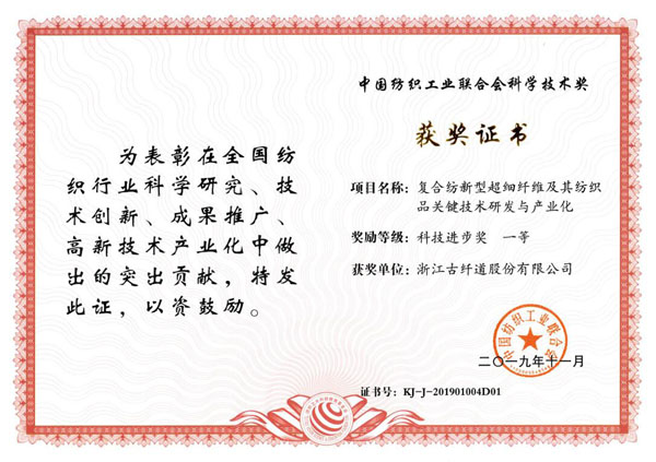 2019復(fù)合紡新型超細纖維及其紡織品關(guān)鍵技術(shù)研發(fā)與產(chǎn)業(yè)化(科技進步獎一等)